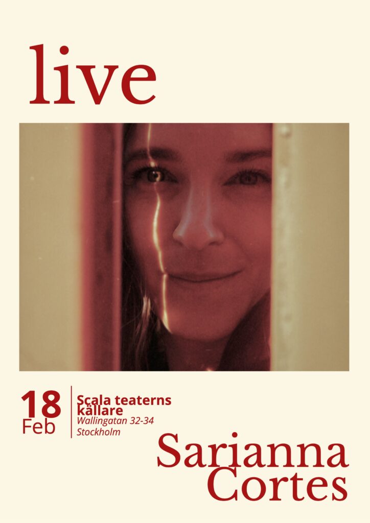 Sarianna Cortes är lite av en doldis på Stockholms musikscen, en singer/songwriter uppvuxen i Stockholm, med rötter på Island och i Finland. Med en röst som får dig att stanna upp bjuder hon på dream pop influerad av artister som Feist, Laura Marling och Brandi Carlile. Förutom eget material har hon även släppt singeln ’Bambino’ med ISON och Daniel Boyaciouglu samt ’Inatt jag drömde’ med Lars Bygdén och