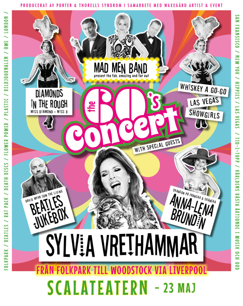 Sveriges bästa 60-talsband THE MAD MEN BAND med very special guests SYLVIA VRETHAMMAR, ANNA-LENA BRUNDIN, David Myhr som THE LIVING BEATLES JUKEBOX och go-go-glamourdamerna i DIAMONDS IN THE ROUGH sveper med er in i och igenom 1960-talets musik och händelser.