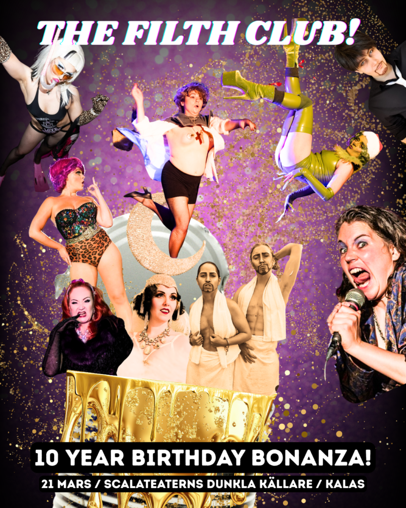 Så, den 21 mars blir det dubbelt kalas. Först och främst för The Filth Club som vid det här laget har blivit ett eget väsen. En varelse med världens bästa publik! Sonja har bjudit in sina favoritakter från dessa 10 år och det blir en kavalkad av svettpärlor från landets bästa undergroundartister.
