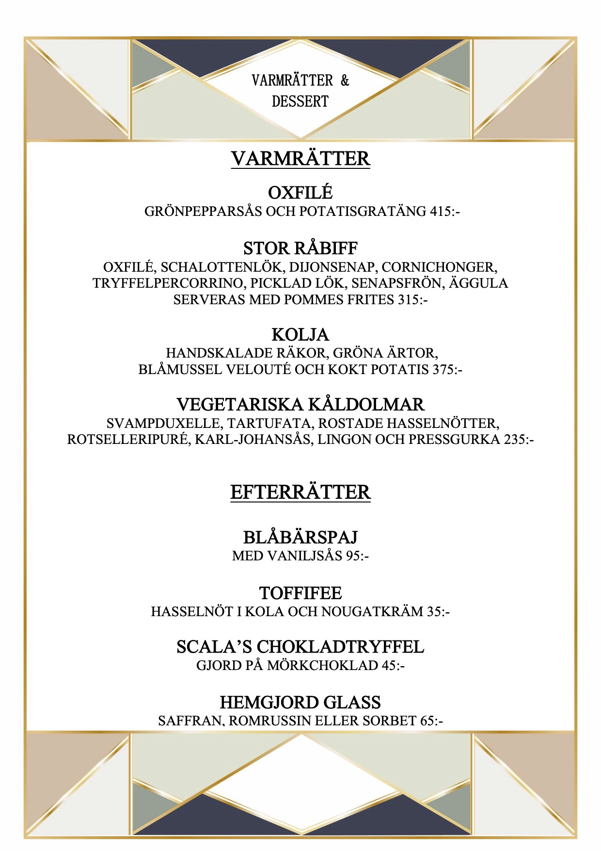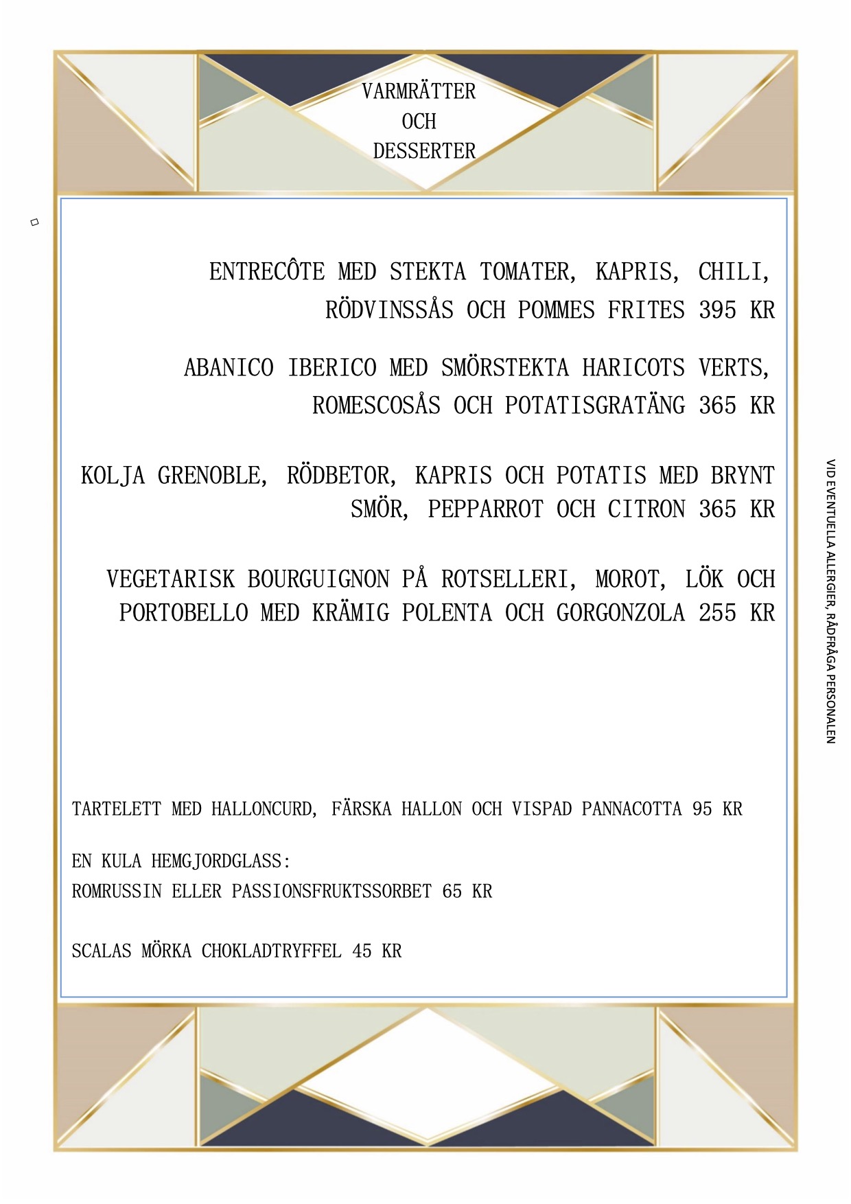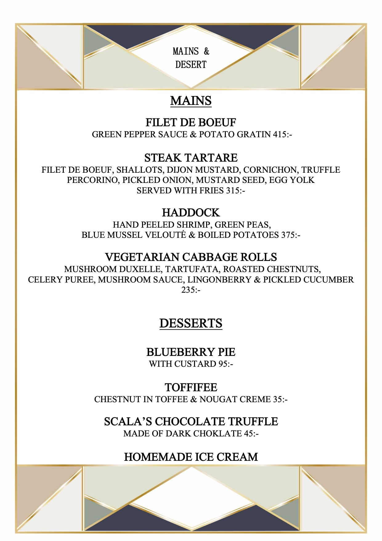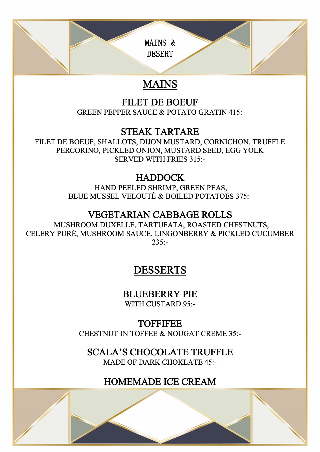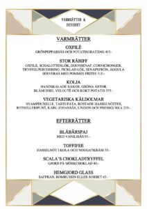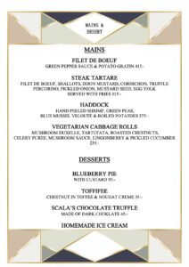 Restaurangen är Scalas hjärta och här samlas grannar, musiker, trollkarlar, teaterbesökare, skådespelare, komiker och helt vanligt folk. Alla med samma mål som vi – att ha en riktigt trevlig kväll.